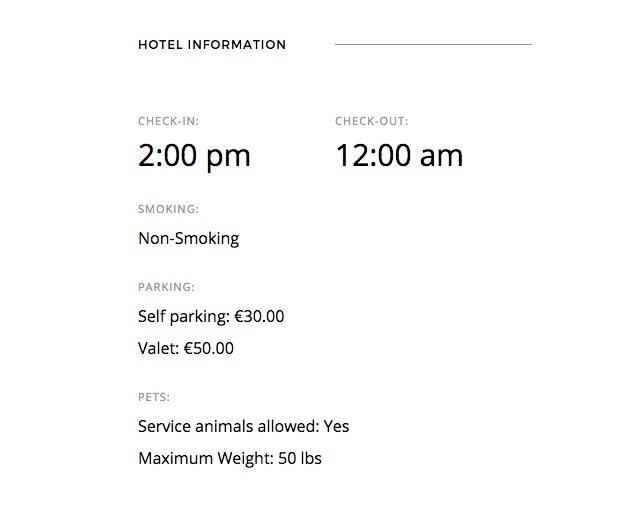 <ul class="gk-info"> <li class="gk-info-col-2"> <dl> <dt>Check-in:</dt> <dd><strong>2:00 pm</strong></dd> </dl> </li> <li> <dl class="gk-info-col-2"> <dt>Check-out:</dt> <dd><strong>12:00 am</strong></dd> </dl> </li> <li> <dl> <dt>Smoking:</dt> <dd>Non-Smoking</dd> </dl> </li> <li> <dl> <dt>Parking:</dt> <dd>Self parking: €30.00</dd> <dd>Valet: €50.00</dd> </dl> </li> <li> <dl> <dt>Pets:</dt> <dd>Service animals allowed: Yes</dd> <dd>Maximum Weight: 50 lbs</dd> </dl> </li> </ul>